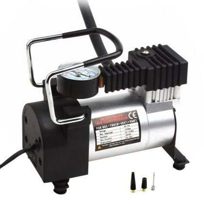 Práctico compresor pequeo de aire de 12V de 100 PSI que se conecta al cargador del coche, ideal para inflar ruedas de coches, motos, bicicletas, balones, colchonetas, etc. Incluye diferentes boquillas. Rápida capacidad de inflado para todo tipo de artículos. Diseo portátil y de fácil almacenamiento. Indicador de presión, útil para inflar ruedas de autos, bicicletas, pelotas, flotadores, inflables, colchones y muchos más.
