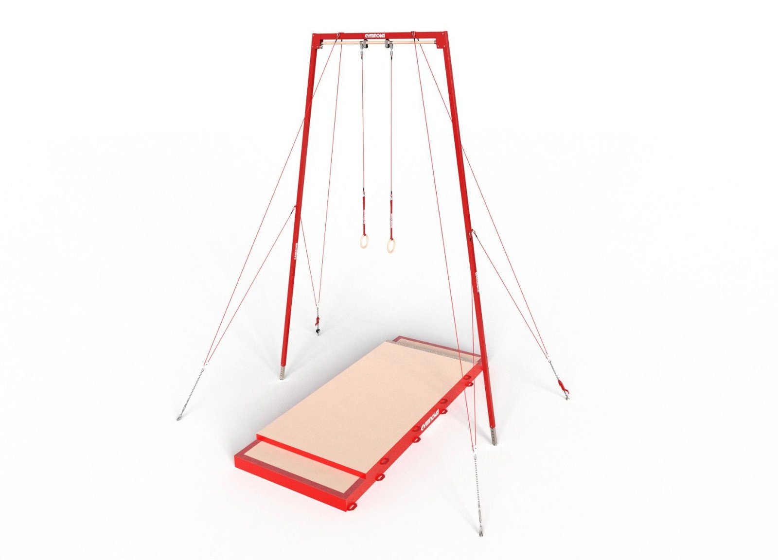 Este pórtico de anillas, homologado por la F.I.G., puede regularse en elasticidad a partir del suelo (de normal a muy extensible). Gracias a la barra de suspensión flexible, se adapta a la técnica y a la estatura de cada gimnasta para ofrecer una experiencia de uso óptima.